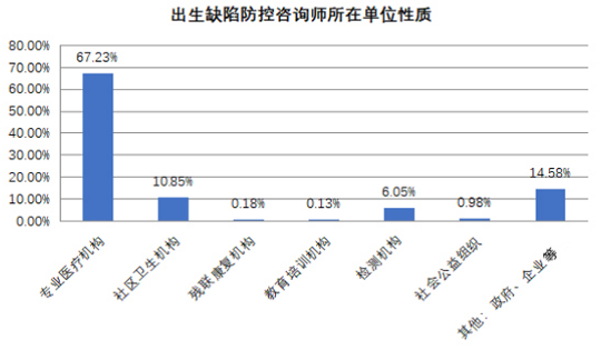 從單位性質(zhì)來看,專業(yè)醫(yī)療機(jī)構(gòu)中的出生缺陷防控咨詢師最多,占比67.23%。其他分別為:10.85%在社區(qū)衛(wèi)生機(jī)構(gòu),14.58%政府機(jī)關(guān)、企業(yè),6.05%在檢測機(jī)構(gòu),1.29%在殘聯(lián)康復(fù)機(jī)構(gòu)、教育機(jī)構(gòu)、社會公益組織。由此可見,出生缺陷防控咨詢師的從業(yè)范圍并不只局限于專業(yè)醫(yī)療機(jī)構(gòu),而且分布在與出生缺陷防控相關(guān)各行各業(yè),就業(yè)面廣。